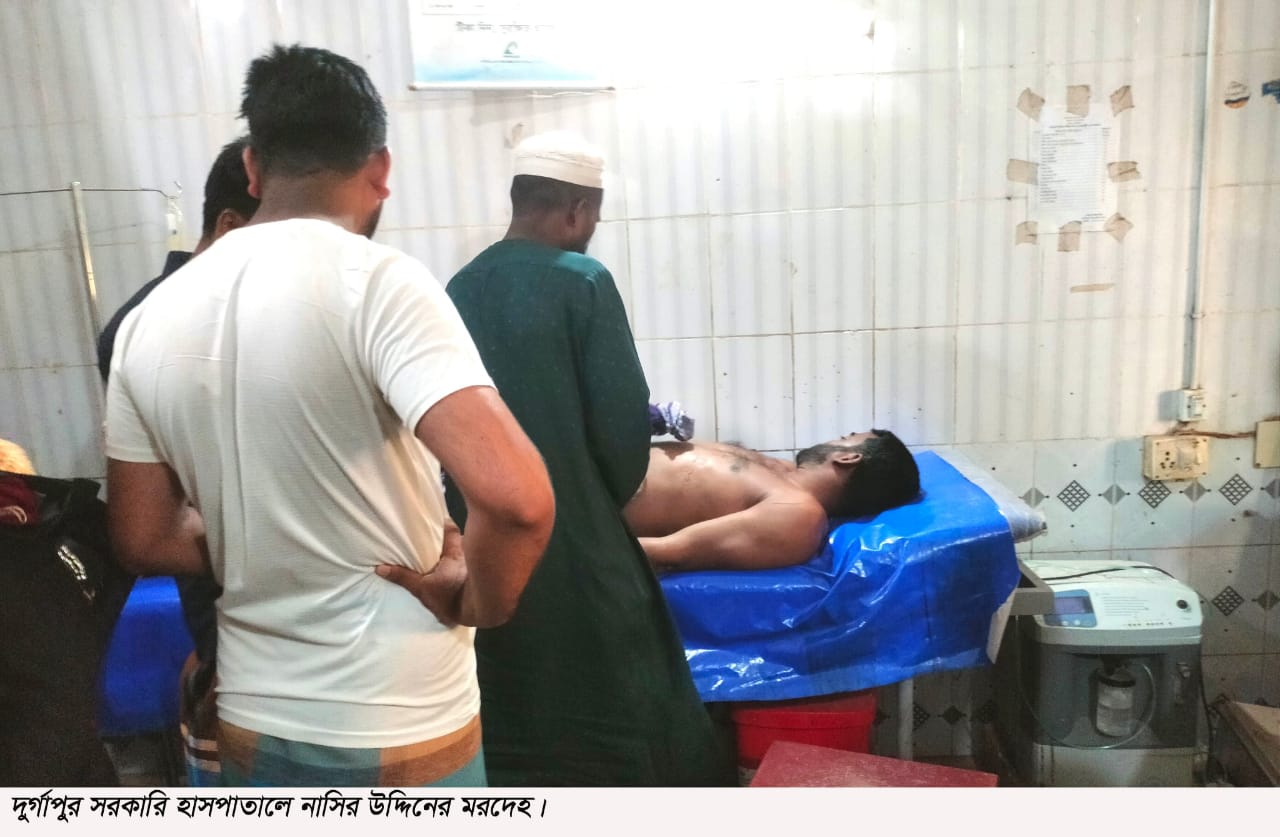 পুকুরে মাছ ধরতে গিয়ে বিদ্যুৎপৃষ্ঠ হয়ে মো. নাসির উদ্দিন (৩০) নামের এক যুবকের মৃত্যু হয়েছে। শনিবার (১৯ এপ্রিল) দুপুরে এ মৃত্যুর ঘটনা ঘটে। নাসির উদ্দিন পাশবর্তী লেঙ্গুরা ইউনিয়নের শিবপুর গ্রামের কৃষক আতাব উদ্দিনের ছেলে। স্থানীয় ও নিহতের স্বজনরা জানান, শনিবার দুপুর ১২ ঘটিকার সময় বাড়ির পাশেই এক পুকুরে মাছ ধরতে নামে নাসির উদ্দিন। ওই সময় বিদ্যুৎতের মোটর দিয়ে পুকুরের কিছু পানি সেচের জন্য লাইন দিলে বিদ্যুৎতের তার ছিড়ে পানিতে পড়ে যায়। ওইসময় বিদ্যুতায়িত হয়ে গুরুতর অসুস্থ্য হয়ে পরে নাসির। পরবর্তিতে বিদ্যুৎতের লাইন বন্ধ করে স্বজনরা তাকে পুকুর থেকে উদ্ধার করে দ্রুত দুর্গাপুর উপজেলা স্বাস্থ্য কমপ্লেক্সে নিয়ে এলে, কর্তব্যরত চিকিৎসক তাকে মৃত ঘোষনা করেন।