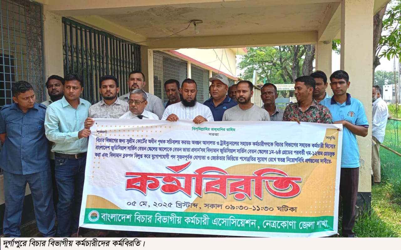 বেতন-ভাতা কাঠামো, পৃথক সচিবালয়, গ্রেড পরিবর্তন ও স্বতন্ত্র নিয়োগবিধি বাস্তবায়নের দাবিতে সারাদেশের মতো নেত্রকোনার দুর্গাপুরে দুই ঘণ্টার কর্মবিরতি পালন করেছেন বিচার বিভাগীয় কর্মচারীরা। সোমবার (৫ মে) সিনিয়র সহকারি জজ আদালত প্রাঙ্গণে বাংলাদেশ বিচার বিভাগীয় কর্মচারী অ্যাসোসিয়েশন, নেত্রকোনা জেলা শাখার আয়োজনে এ কর্মসূচি পালিত হয়।