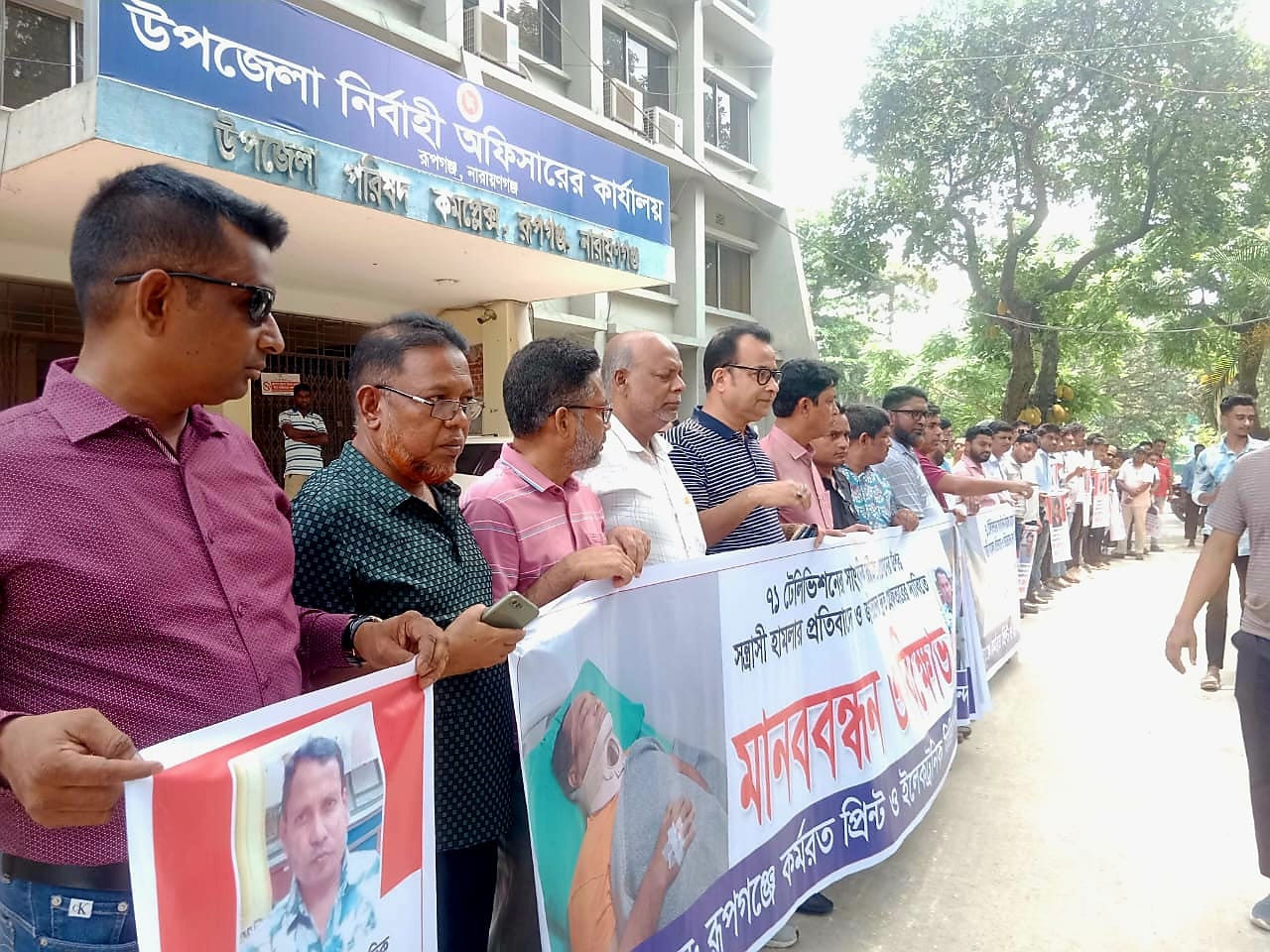 নারায়ণগঞ্জের রূপগঞ্জে ৭১ টেলিভিশনের রূপগঞ্জ প্রতিনিধি সাংবাদিক রিয়াজ হোসেনের উপর সন্ত্রাসী হামলার প্রতিবাদে ও জড়িতদের দ্রুত গ্রেপ্তারের দাবিতে মানববন্ধন ও বিক্ষোভ কর্মসূচি পালন করেছেন স্থানীয় প্রিন্ট ও ইলেকট্রনিক মিডিয়ায় কর্মরত সাংবাদিকরা। এসময় তাদের সাথে একাত্বতা প্রকাশ করে কর্মসূচীতে অংশগ্রহণ করেন নারায়ণগঞ্জ জেলা সাংবাদিক ইউনিয়ন, আড়াইহাজার থানা প্রেসক্লাব, আড়াইহাজার রিপোর্টাস ক্লাবের সাংবাদিক বৃন্দ ও বৈষম্য বিরোধী ছাত্র আন্দোলনের প্রতিনিধিরা। মঙ্গলবার সকালে রূপগঞ্জ উপজেলা নির্বাহী কর্মকর্তার কার্যালয়ের সামনে এ কর্মসূচি পালিত হয়।