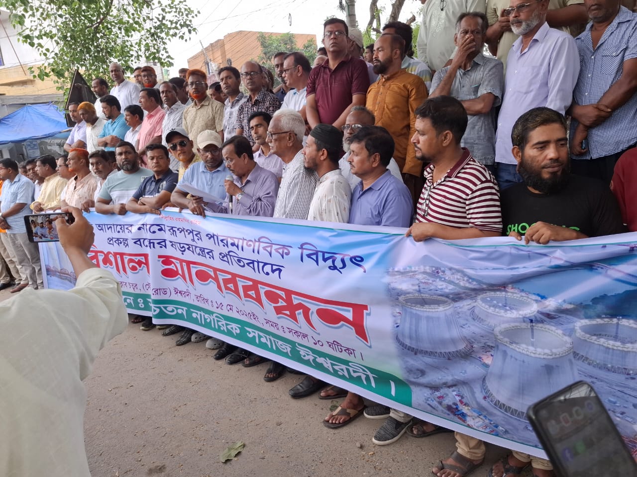 দাবি আদায়ের নামে পাবনার ঈশ্বরদীর রূপপুর পারমাণবিক বিদ্যুৎ প্রকল্প বন্ধের ষড়যন্ত্রের প্রতিবাদে বৃহস্পতিবার ( ১৫ মে) সকাল ১০ টা থেকে ঈশ্বরদী স্টেশন রোডের প্রাণকেন্দ্র ফকিরের বটতলায় বিশাল মানববন্ধন ও সমাবেশ অনুষ্ঠিত হয়েছে।