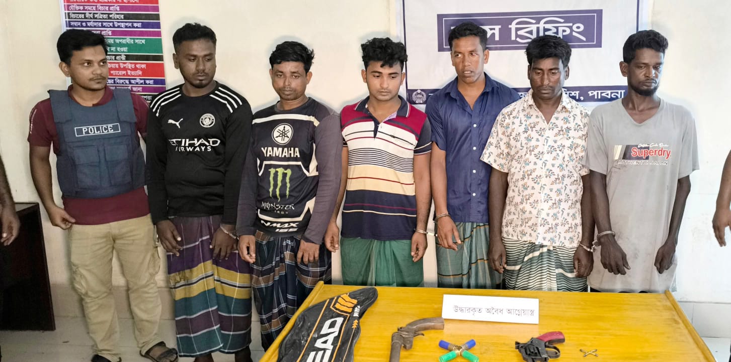 অভিযানে ইয়াছিন আলী (৩৫), সোনারুল (২৬), হবি মন্ডল (২৬), সাগর প্রাং (২৭), সোহেল প্রাং (২৮) ও মিরাজ প্রাং (২৪) কে আটক করা হয়। আটককৃতদের বিরুদ্ধে বৃহস্পতিবার মামলা দায়ের হয়েছে। আটককৃত আসামীদের জেল হাজতে প্রেরণ করা হয়েছে বলে জানা গেছে। প্রেস ব্রিফিংয়ে লিখিত বক্তব্যে ঈশ্বরদী থানার অফিসার ইনচার্জ মো. আব্দুন নূর বলেন, গত বেশ কিছুদিন যাবত ঈশ্বরদী থানাধীন সাঁড়াঘাট এলাকায় পদ্মা নদীতে ও চরাঞ্চলে বালু উত্তোলন ও আধিপত্য বিস্তারকে কেন্দ্র করে দুষ্কৃতিকারীরা অবৈধ আগ্নেয়াস্ত্র প্রদর্শন ও মহড়াসহ গোলাগুলির ঘটনা ঘটায়। এতে গত ২২ মে পদ্মা নদীর অভ্যাস্তরে গোলাগুলিতে ৬ জন গুলিবিদ্ধ হয়ে আহত হয়। এঘটনায় ৩১ মে ঈশ্বরদী থানায় মামলা দায়ের হয়। এছাড়ও গত ৫ জুন দৃষ্কৃতিকারীরা প্রকাশ্যে অবৈধ আগ্নেয়াস্ত্র প্রদর্শন ও মহড়ার ঘটনায় ঈশ্বরদী থানায় আরেকটি মামলা ৭ জুন তারিখে দায়ের হয়। ঈশ্বরদী সার্কেলের অতিরিক্ত পুলিশ সুপার প্রণব কুমারসহ থানার কর্মকর্তারা এসময় উপস্থিত ছিলেন।